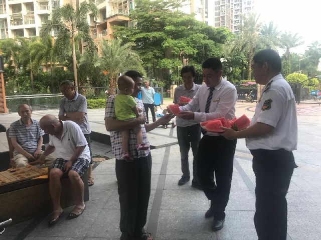 物业管理处为业主精心准备了冰冰凉凉的绿豆汤和西瓜,使得小区的空气中弥漫着淡淡的绿豆清香和甜甜的西瓜果香。