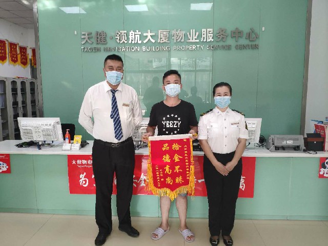 5月14日一大早,西南区域公司天健领航大厦服务中心收到刘先生送来的一面题有“拾金不昧 品德高尚”的锦旗,感谢物业安管员张京波同志拾金不昧的高尚品德。