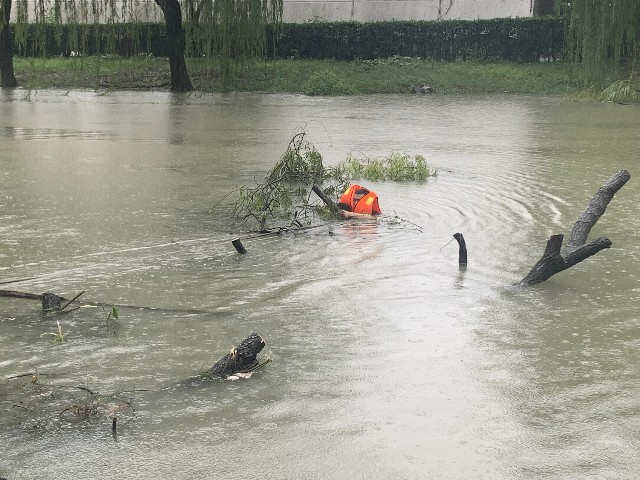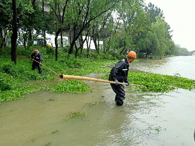 绍兴市柯桥区行政中心内湖边上的十几株大树全部横跨在湖面上,严重影响了洪水排放。项目负责人胡志强身先士卒,冒着大雨,拿起工具毫不犹豫地跳进湖中,锯断树枝由岸边同事拽上岸,体力透支了就返回岸边休息,片刻后又跳进水中。通过 大家四个小时的共同努力,最终使湖面水流恢复通畅。