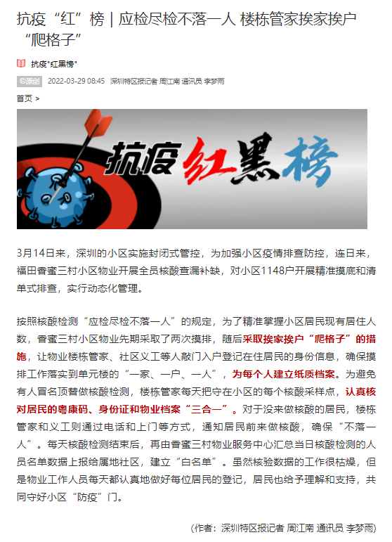 【深圳特区报&读特客户端】抗疫“红”榜|应检尽检不落一人 楼栋管家挨家挨户“爬格子”